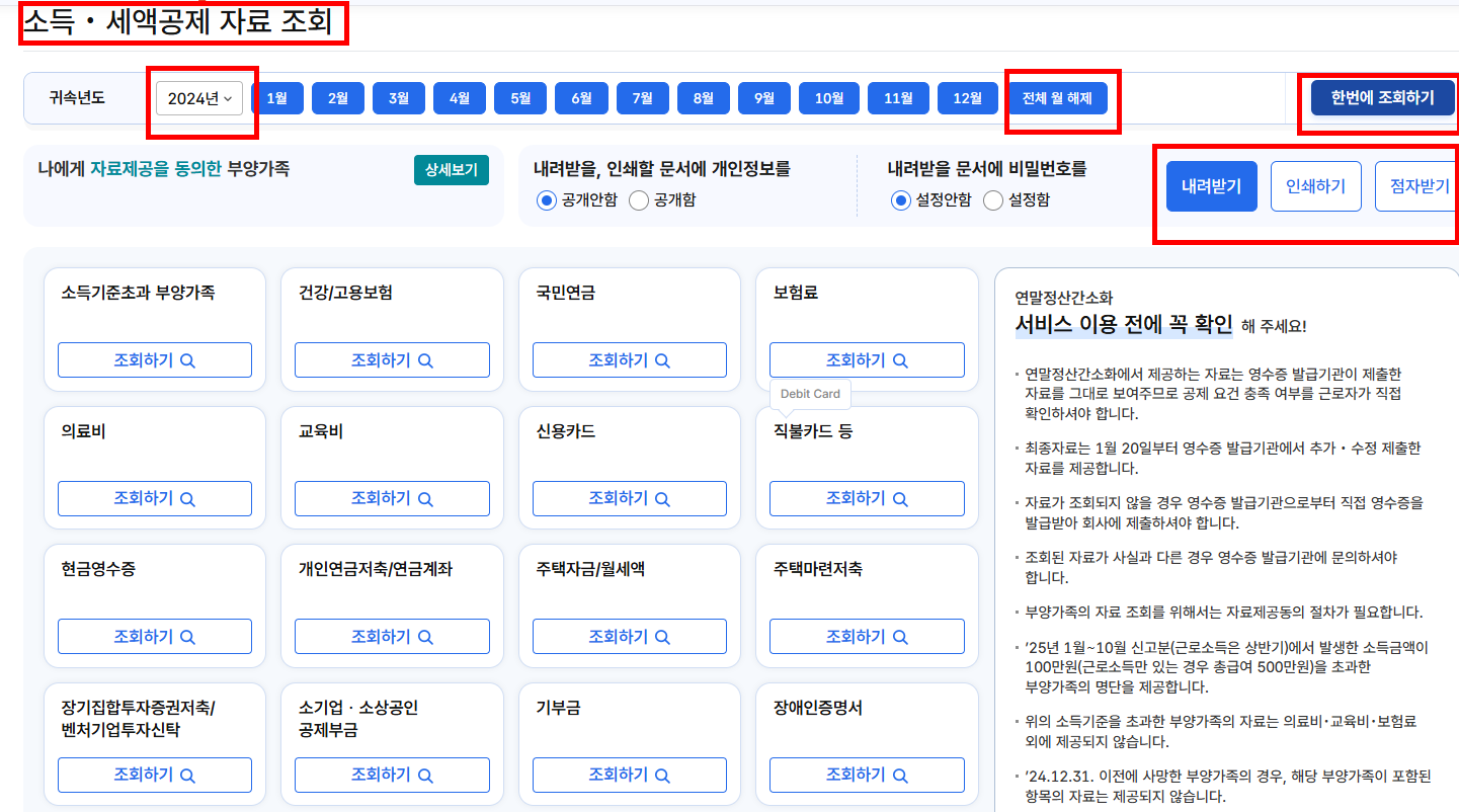 - 주요 확인 항목: 건강보험료, 국민연금, 보험료(보장성), 의료비(병·의원), 교육비(초·중·고·대학 등록금), 신용·체크카드 사용액, 주택자금, 연금계좌 등