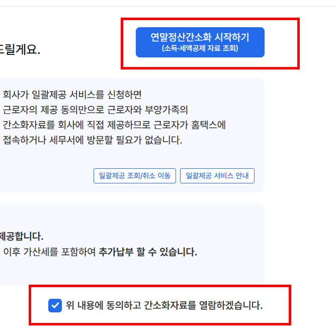 2.[동의하고 간소화서비스를 열람하겠습니다]를 누른후 [연말정산간소화 시작하기]로 들어간다