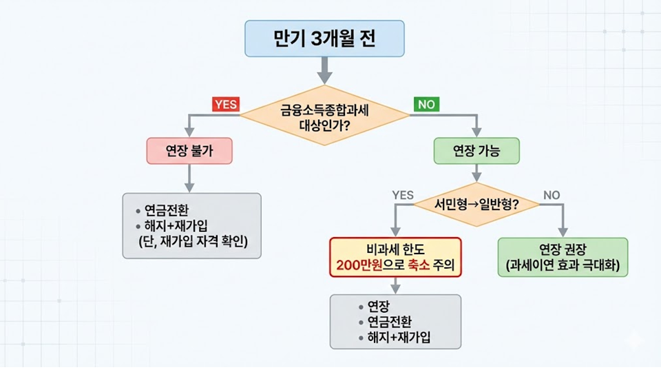 "의무가입기간 3년이 지났다면, 나는 지금 '비과세 한도·연금전환·재가입·과세이연' 중 어떤 걸 최우선으로 할지 먼저 정하고, 그다음에 '연장' vs '해지'를 결정하시면 됩니다."